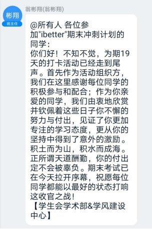 为提高同学们期末复习效率、营造帮扶和鼓励的学习氛围、加强自我监督,学院学生会学术部和学院学风建设中心联合在期末阶段开展/font>/span>“ibetter/font>”期末冲刺计划/font>/span>,在形成激励氛围的同时为博彩网站
