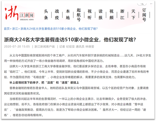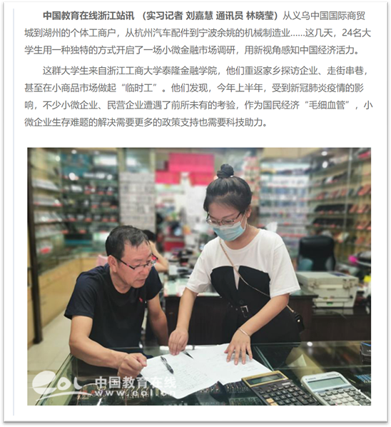 24/span>名大学生,重返家乡探访企业、走街串巷,甚至在小商品市场做起“临时工”。从义乌中国国际商贸城到湖州的个体工商户,从杭州汽车配件到宁波余姚的机械制造业……此次暑期社会实践调研团队一共分为6/span>组,每组4/span>人,分别在杭州、温州、宁波、金华等地进行,共走访了510/span>家小微企业。/span>/p> 他们用一种独特的方式开启了一场小微金融市场调研,用新视角感知中国经济活力。今年上半年,受到新冠肺炎疫情的影响,不少小微企业、民营企业遭遇了前所未有的考验,作为国民经济“毛细血管”,小微企业生存难题的解决需要更多的政策支持也需要科技助力。/span>/p> 调研团队主要了解家乡的小微企业的经营状况和金融服务情况,在调研的这段时间,他们接触到了各种类型的小微企业,身边随处可见的小吃店、服装店、超市,60%/span>小微企业的月营业额在5/span>万元以下。再从企业规模看,这次调研结果显示,60%/span>的小微企业员工不到5/span>人,经营年限在5/span>年以上的企业占50%/span>。小微企业及个体户中,大部分是联系千家万户的“小店经济”,在调研中发现,20.5%/span>小微企业及个体户面临现金流危机。其中,有融资需求的小店中,70%/span>的小微企业主表示只要给予一点支持,就能很快迈过难关。/span>/p> 虽然这些大学生都才大一,他们宣传国家出台的一系列金融综合改革政策外,还倾听小企业主们的心声,并真实地将他们的所见、所闻、所感记录了下来。通过这次调研的内容可以了解当地小微金融市场需求状况,结合现有金融产品系,确定未来可提供的具体产品策略,包括担保、利率、期限和还款方式等主要要素,另外本次实践调研中获得的调研数据,也将会用于之后的“挑战杯”大学生课外学术作品竞赛中。这是一次很有意义的调研活动,让还在学理论的大一学生回到家乡调研,感受中国经济的脉动,既有一种情怀也有一种责任。/span>/span>/p> 这次意义特别的调研活动受到许多校内外媒体的关注和报道,包括中国教育在线、钱江晚报、浙报融媒体、浙江新闻、科技金融时报等多家媒体都对博彩网站