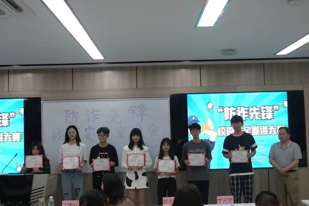 “防诈先锋”校园安全宣讲团成员,他们将在日后参与防诈反骗的宣传工作,助力平安校园建设。/span>/p> /p> /p> /p> /p> /p> /p> 随后,韩志强老师对选手们的表现进行了点评,总结了诈骗的常见手段,强调了增强防诈骗意识的重要性,他希望同学们可以提高警惕意识,营造“人人说防范,人人懂防范”的良好氛围。/span>/p> /span>最后,主持人宣布此次“防诈先锋”校园安全宣讲大赛的最终成绩,评委们为获奖选手颁发荣誉证书并合影留念。/span>/p> /p> /p> /p> /p> /p> /p> /p> /p> /p> 号码陌生勿轻接,虚拟电话设陷阱;/span> /p>