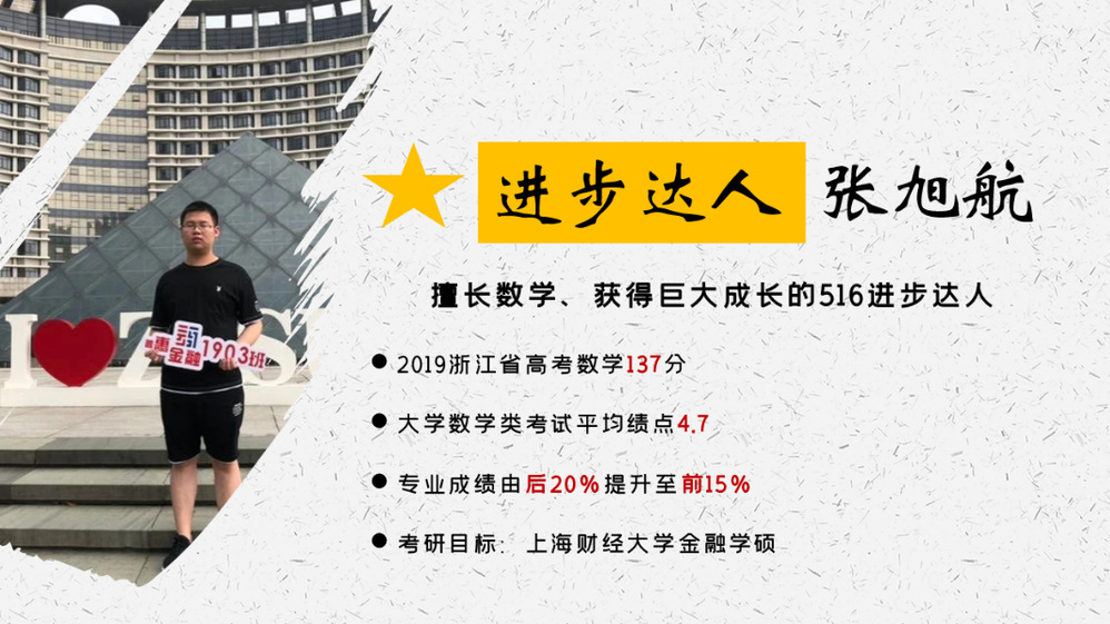 张旭航作为寝室进步达人,在室友的影响与帮助下,专业成绩从大一上的年级第87名,进步到大二上的年级第10名,原本在课堂上爱打瞌睡、玩手机的他,在室友辅导与分享下,重拾学习金融学热情,同时他也发挥自身数学特长,帮助室友解惑。他的起点虽不高,但后劲很足,未来的他将会更加奋发向上!
