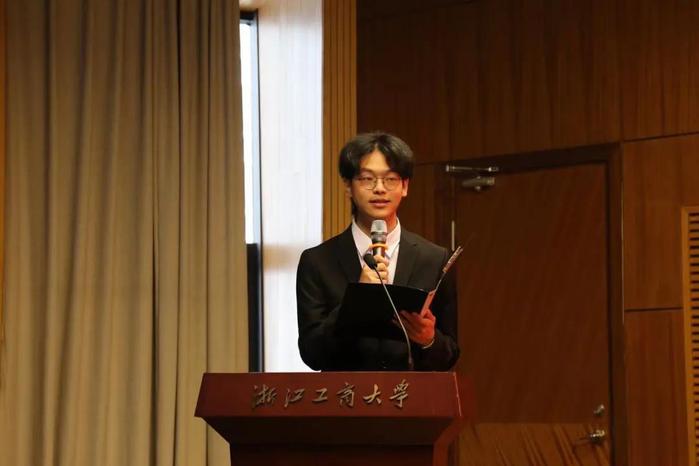 普惠金融2103班严驰航同学作为2021级新生代表发言。严同学用儒学经典《大学》开篇中的三个关键词“明德”“亲民”“至善”,旨在告诉我们要学会自主学习,与人为善,尽力把一切做到最好。最后,他表示作为第三届泰隆学子,我们是幸运的,但我们也同样面临各种各样的挑战,“今天尽力做的虽然辛苦,但未来发生的都是礼物”。愿我们满怀热爱奔赴这一场山海!