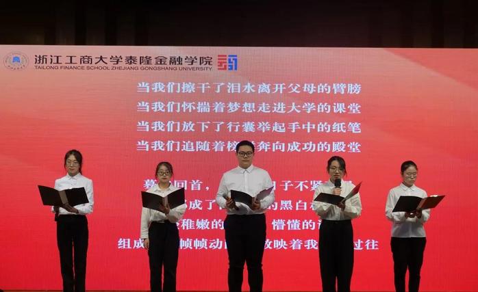 石帅阳、朱祉祎、陈鸿帆、周晨阳、姚思忱五位同学作为新生代表朗诵诗词《向阳而生 迎风翱翔》。通过12年的潜心学习,我们换来了商大的入场券,作为新一届的TFSers,带着青春的希望,就让我们从这里起航,用无悔的青春续写商大和泰隆新的辉煌!