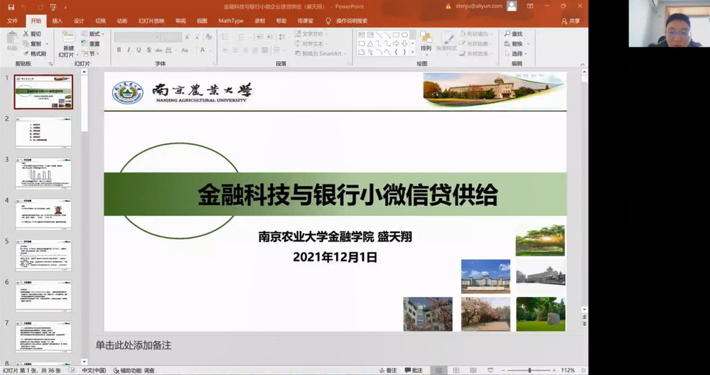 2021年12月1日,南京农业大学博彩网站 副教授、江苏省国际金融学会理事、江苏省市场经济研究会理事盛天翔应邀出席博彩网站 举办的商泰普惠金融论坛,为师生作了一场题为“金融科技与银行小微企业信贷供给”的线上专题讲座。讲座由博彩网站 院长马丹教授主持,博彩网站 、博彩网站 和其他院校的老师及学生参加了讲座。