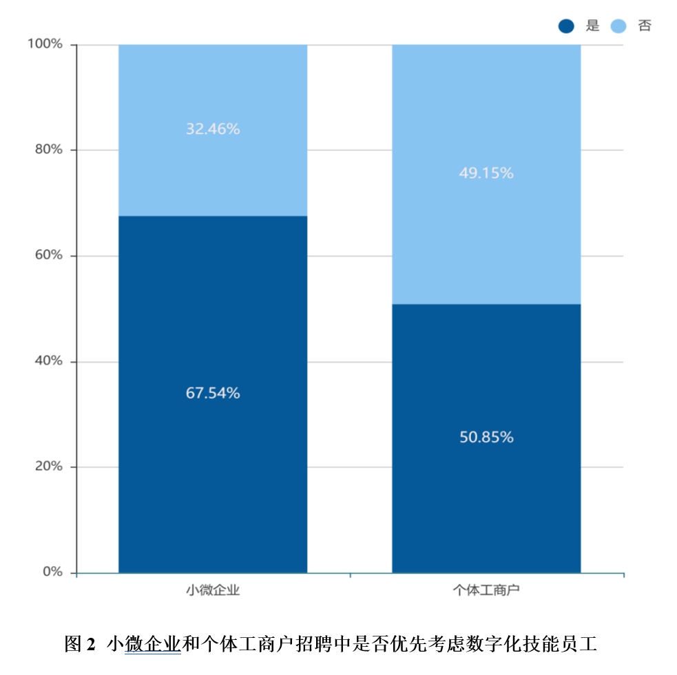 尽管小微企业和个体工商户的数字化转型进展比较缓慢且面临着一些障碍,但小微企业和个体工商户普遍都表示出对数字化转型的兴趣,表明会在员工招聘和未来的投入等方面扩大数字化战略布局。从员工招聘来看,超过六成的小微企业和超过五成的个体工商户在招聘过程中都会优先考虑具有数字化技能的员工。