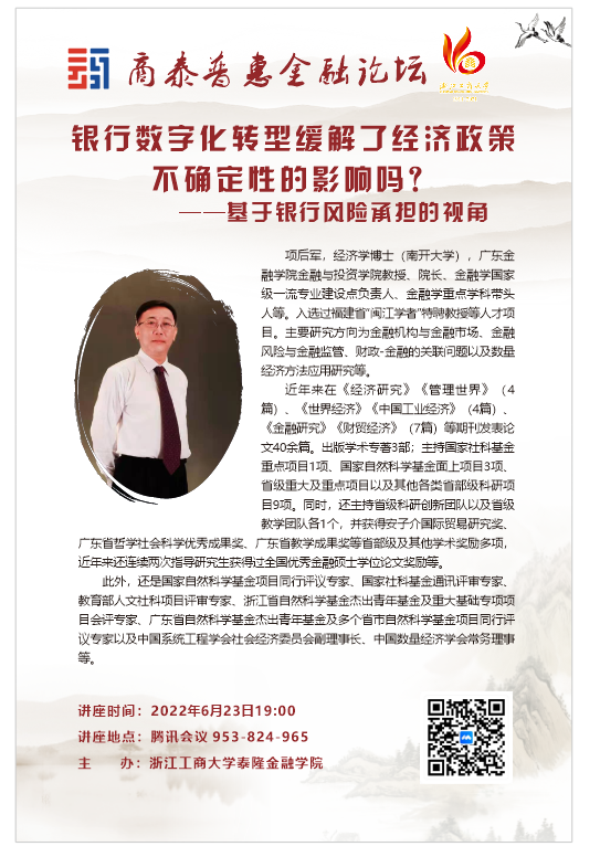 预告|商泰普惠金融论坛——银行数字化转型缓解了经济政策不确定性的影响吗? ——基于银行风险承担的视角