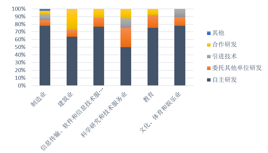 调查结果显示,自主研发是小微企业创新活动的主要方式。其中,制造业,信息传输、软件和信息技术服务业以及文化、体育和娱乐业自主研发的企业比例均在80%左右;科学技术服务业自主研发比例为50%,委托其他单位研发比例约为30%,可能的原因之一是科学技术服务业的自主研发的门槛较高,而小微经营主体相关研发能力相对薄弱。