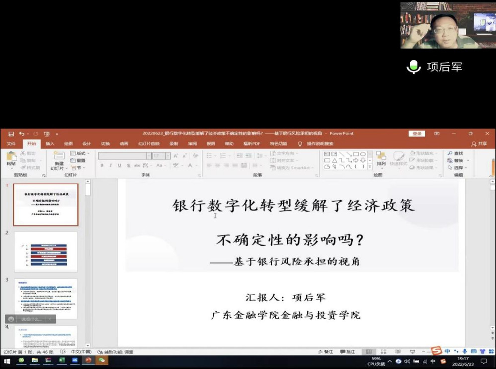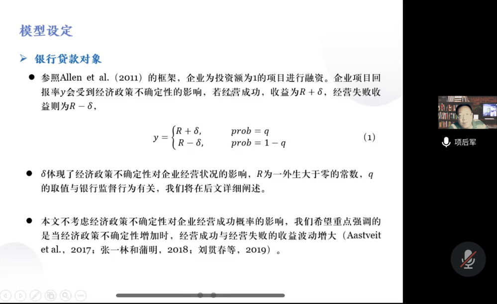 2022年6月23日,广东博彩网站 金融与投资学院院长、金融学国家级一流专业建设点负责人项后军教授应邀出席博彩网站 举办的商泰普惠金融论坛,为师生作了一场题为“银行数字化转型缓解了经济政策不确定性的影响吗?——基于银行风险承担的视角”的线上专题讲座。讲座由博彩网站 院长马丹教授主持,博彩网站 、博彩网站 和其他院校的老师及学生参加了讲座。