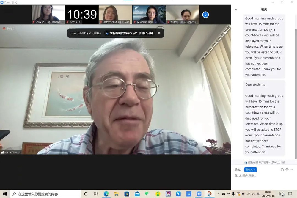 从一开始报名到课程开始之前,我一直怀揣着无比期待的心情,因为觉得这是一件很酷的事情,会充满诸多乐趣。但是到了第一天的正式课程,完全意义上的全英文授课确实让我兴奋的情绪蒙上了害怕的颜色,不管是课堂中Hugh Thomas教授的语速,还是课后测试中的题目,都令我感受到了前所未有的难度。但是,也正是在这“荆棘路”中,不断地激发我,给予我无限的动力去深入学习,不仅仅是课堂内容,更是英语能力,我相信这对于我未来的学习路途有不小的帮助。如果你现在问我,课程开始之后和结束,它还是一件很酷的事情吗?我会很坚定地说“是”。