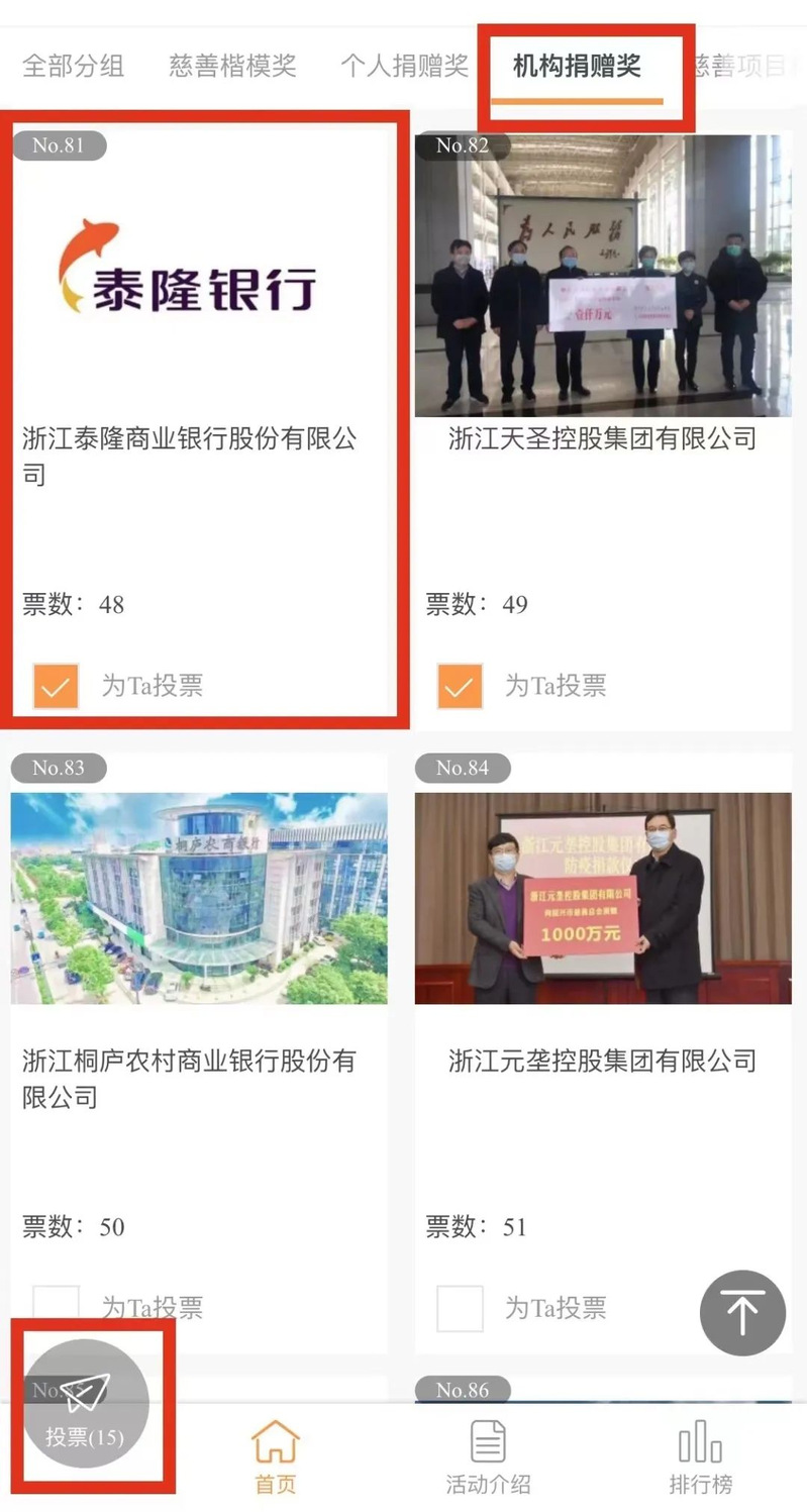 第四步:选择机构捐赠奖81号“浙江泰隆商业银行股份有限公司”,并点击左下角的投票