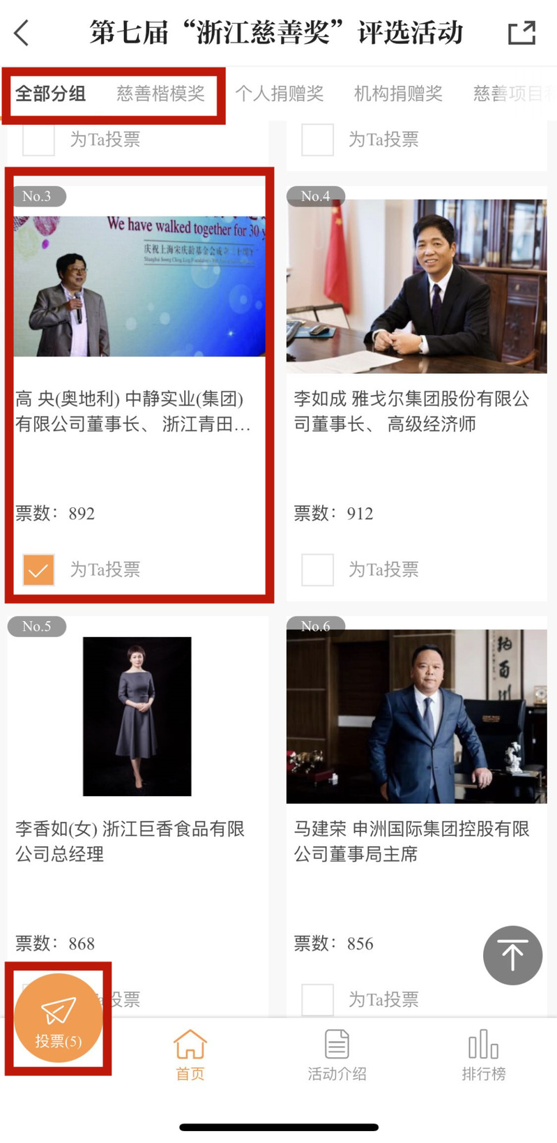 第三步:选择慈善楷模奖3号“高央(奥地利) 中静实业(集团)有限公司董事长、浙江青田之家公益基金会理事”,并点击左下角的投票