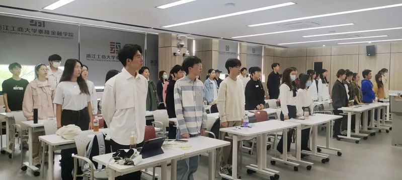 在嘹亮的国歌声中,全体泰隆学子肃穆而立,齐声歌唱。