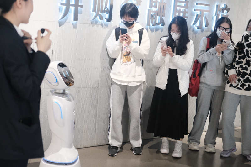 智能机器人小信在场馆门口“就位”,同学们对人工智能表现出极强的兴趣。小信和同学们进行了亲密互动与交流,以幽默风趣的口吻和严密的逻辑解答同学们的各类问题,并通过播放宣传视频,实现了寓教于乐的效果。