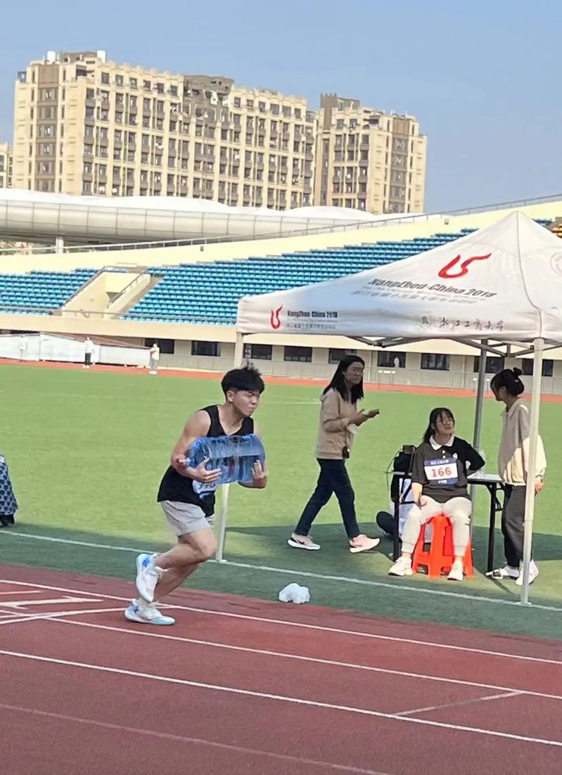 在负重接力赛中,参赛选手们个个化身成了“搬水工”,抱着纯净水奔跑。虽然脖子、胳膊酸痛,但他们依旧坚持着,奋力向终点冲刺。