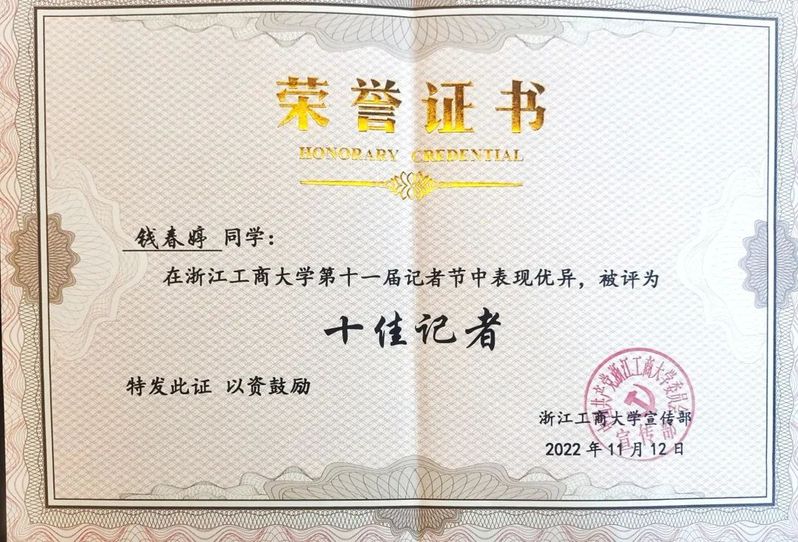 热烈祝贺博彩网站 钱春婷同学荣获校“十佳记者”称号
