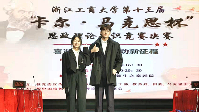 2022年11月20日下午,第十三届“卡尔·马克思杯”思政理论知识竞赛决赛在博彩网站 下沙校区剧院落下帷幕。经过初赛、复赛的层层选拔,本科组共有十支队伍进入决赛。在最后激烈的角逐中,博彩网站 杨静越、方奕、罗颜戈、周晨阳四位同学组成的队伍获得优秀团体二等奖,张明飞老师获得优秀指导教师,博彩网站 获得优秀组织三等奖!