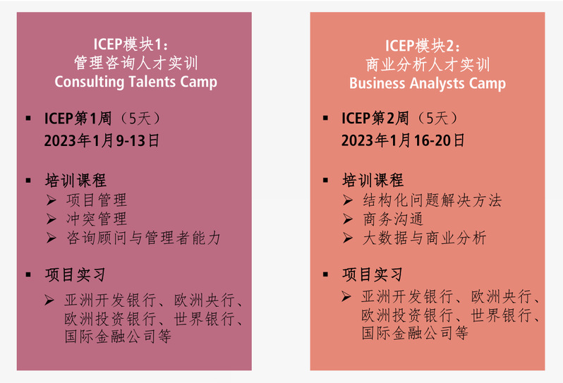 该项目包含两个模块:ICEP模块1—管理咨询人才实训、ICEP模块2—商业分析人才实训,通过国际多边组织的项目实习、普惠金融领域专家认证的课程和国际高管定制的培训,不仅提升了学生的英语写作、交流能力,还提升了普惠金融人才专业化、国际化能力水平。