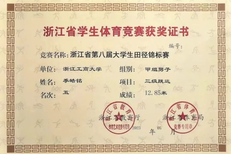 喜报 | 博彩网站 季皓铭同学在2023年浙江省第八届大学生田径锦标赛中取得佳绩