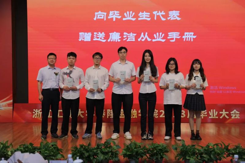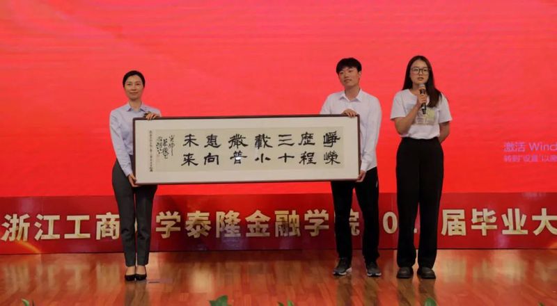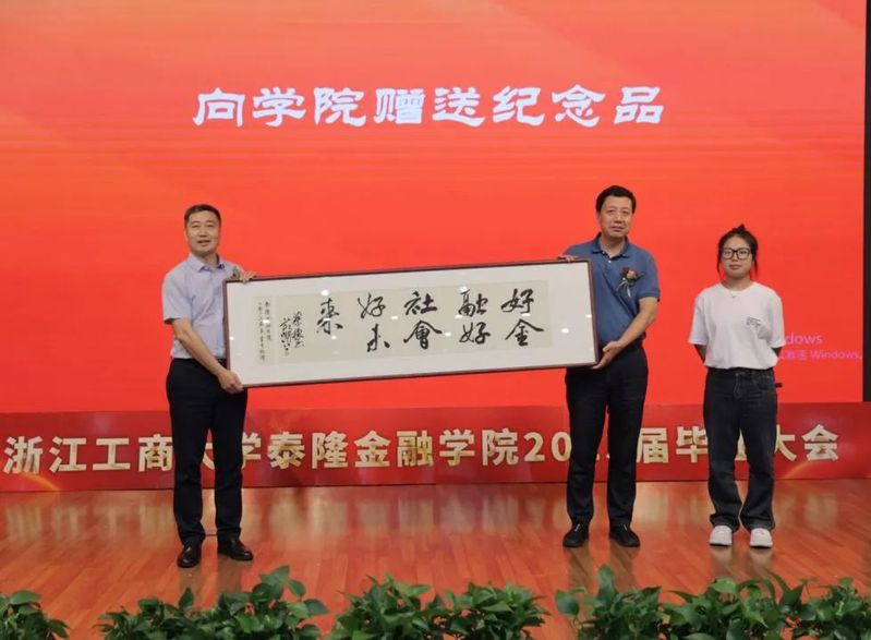 泰隆银行人力资源部副总经理林丽、浙江泰隆慈善基金会秘书长蔡鸿鹏、学院院长马丹、学院党委书记慕兴宏为毕业生赠送毕业礼物,祝愿毕业生带着泰隆银行、泰隆慈善基金会和学院的祝福致知行远,踵事增华!