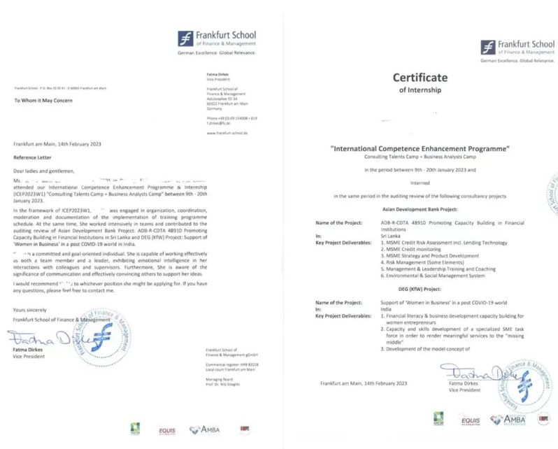 大三暑假,我参与了学院推荐的德国法兰克福财经管理大学的暑期交换项目,共参与世界银行和亚洲开发银行的两个实习项目,成功进入FS国际咨询服务部发展金融咨询人才储备库。