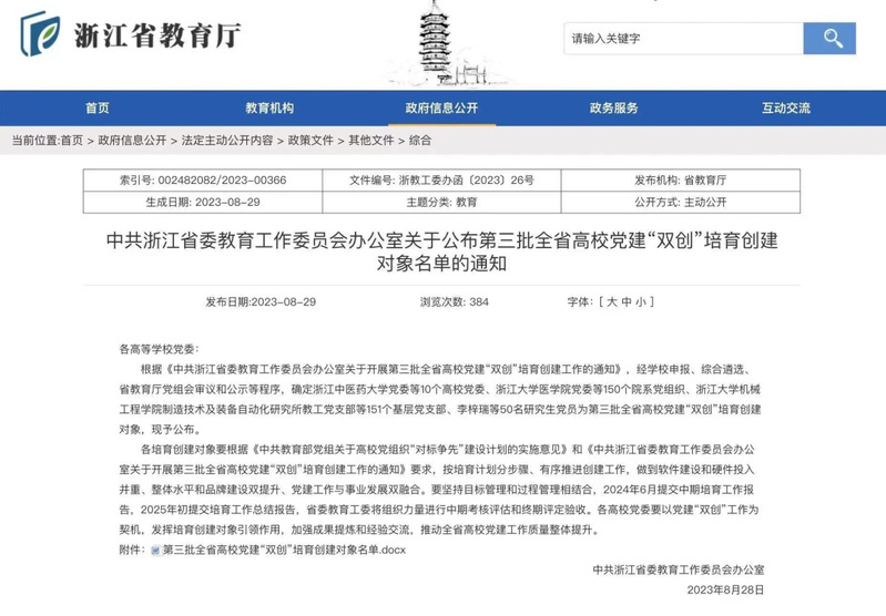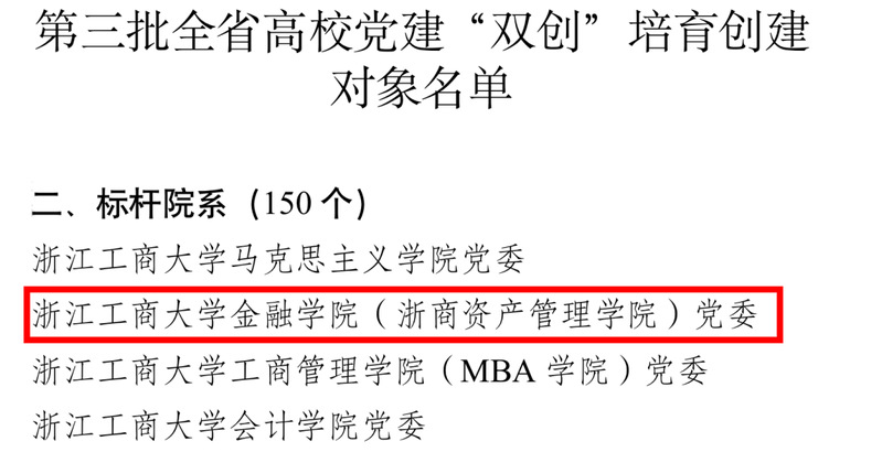 近日,浙江省委教育工委公布了全省第三批高校党建“双创”培育创建对象名单,博彩网站 所在党委博彩网站 (浙商资产管理学院)党委入选全省高校党建“标杆院系”培育创建单位。