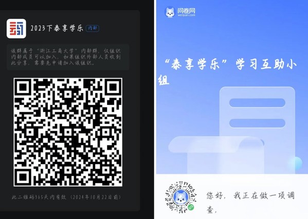 (1)已有意愿伙伴的同学,可以和满足相关参与条件的伙伴自由组合成学习互助小组,然后由在小组中担任助力团成员的同学扫描下方问卷星进行报名。请已填好问卷星报名的小组扫描下方钉钉群二维码加入“泰享学乐”学习互助小组钉钉联络群。