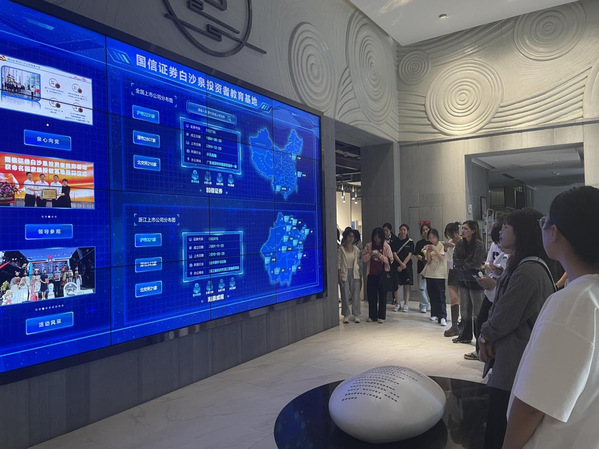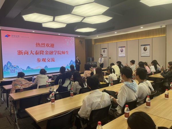 在国信证券工作人员带领下,同学们参观了国信浙江分公司的运营大厅及投资者教育基地,了解证券行业的发展历史、证券公司的运营模式及证券行业的发展现状等。