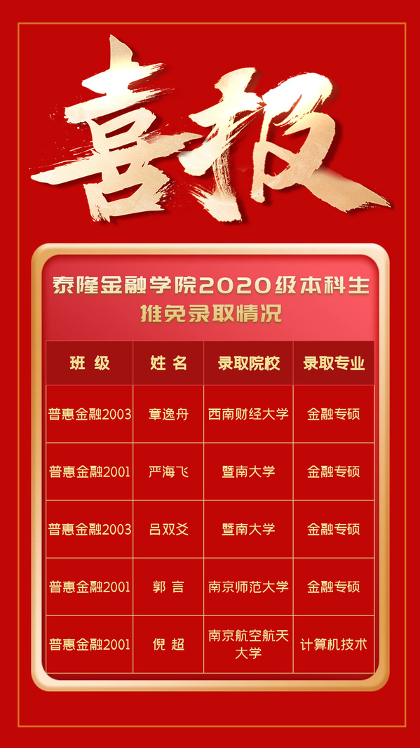 根据全校平均5%左右的保研比例,博彩网站 2020级本科生共有5名优秀学子脱颖而出,成功推免保研至理想学府深造,目前已被西南财经大学、暨南大学、南京师范大学和南京航空航天大学等国内知名双一流高校拟录取。