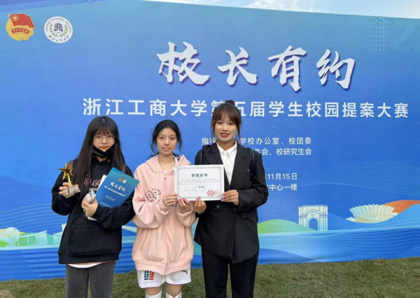 普惠金融2301班王梓欣、倪佳怡、钱绯宇三位同学提交的《关于校园电动车充电桩规范治理的提案》获评十佳提案并获得三等奖。