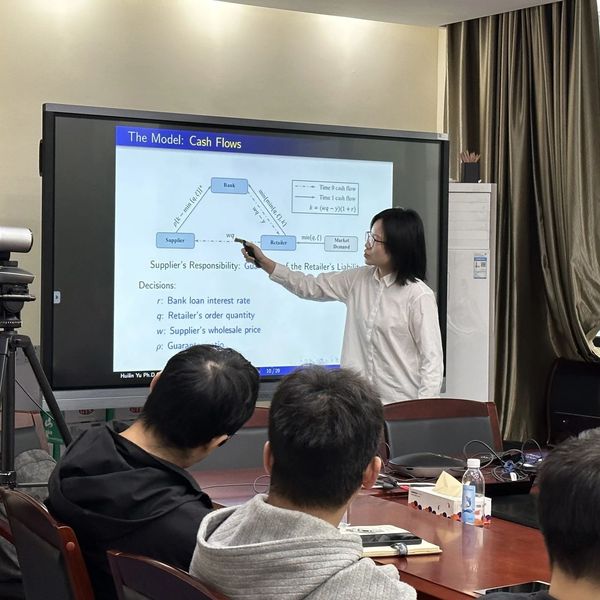 论坛首先由於慧琳博士汇报了最新一篇工作论文,汇报主题为研究权力结构对供应链担保融资博弈框架选择的影响。於慧琳博士介绍了供应链担保融资,这种融资模式有助于应对中小企业市场面临的现金流约束问题,提升整条供应链的价值和效率,因此如何更好的设计担保融资合同成为行业专家聚焦的一个话题。