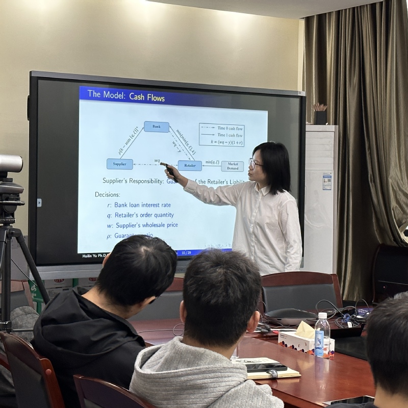 论坛首先由於慧琳博士汇报了最新一篇工作论文,汇报主题为研究权力结构对供应链担保融资博弈框架选择的影响。於慧琳博士介绍了供应链担保融资,这种融资模式有助于应对中小企业市场面临的现金流约束问题,提升整条供应链的价值和效率,因此如何更好的设计担保融资合同成为行业专家聚焦的一个话题。