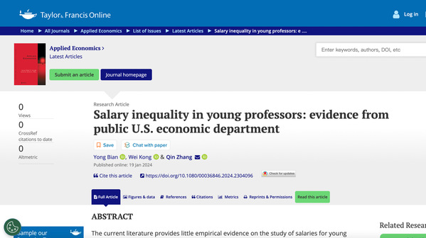 博彩网站 教师卞咏为第一作者和张秦为通讯作者的合作论文Salary inequality in young professors: evidence from public U.S. economic department 在《Applied Economics》期刊发表。