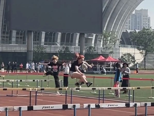 一声发令枪响起,胡珏飞驰而去,步伐轻盈而有力,仿佛踏着云彩。目光炯炯注视着前方,轻轻垫脚一跃而过,如流星划过天际。