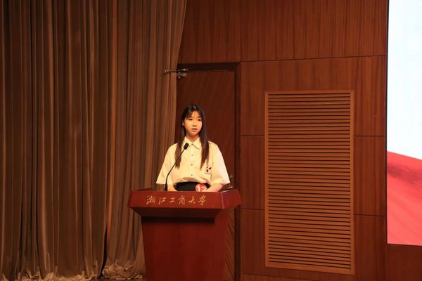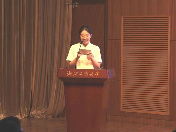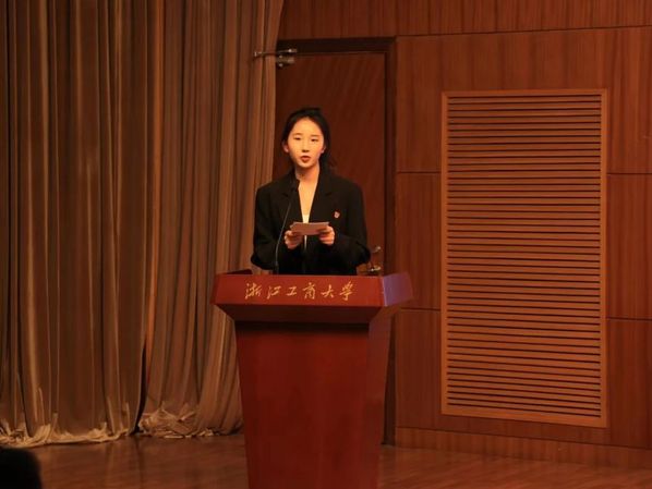 竞选学习之星的徐一丹,她述说着自己大学四年的规划和安排,并介绍了自己所得的各项荣誉:被约翰霍普金斯大学录取为应用经济学硕士,四年综合测评位列年级第一(1/93),拟推荐为浙江省优秀毕业生;连续四年获得校级综合奖学金(综合一等奖学金三次),省政府奖学金,曾获2022年度校级专项奖学金(NITORI国际奖学金);2022年度校级优秀共青团员、2020-2022年度优秀学生干部、2022-2024年度三好学生;荣获2022年度浙江省大学生金融创新大赛B类案例分析组二等奖(1/5)、第六届我心中的思政课全国高校大学生微电影大赛三等奖(主创成员);现任普惠金融2003班班长,曾任院文艺部部长、校艺术团人事部部长,均考核优秀。