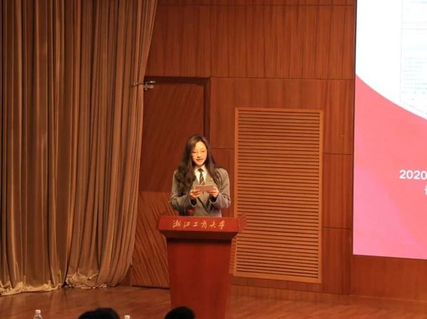 竞选自强之星的郭言,她通过回顾了自己四年的大学生涯,感谢了帮助她成长的老师同学们,开启自己的演讲:推免至南京师范大学金融专硕,拟推荐为浙江省优秀毕业生;连续四年获得校级优秀学生综合奖学金;连续两年获得国家励志奖学金、三好学生;连续两年获得浙江省金融创新大赛省级奖项,其中C类学术论文二等奖(2/4),C类学术论文三等奖(2/2);曾任院团委副书记,获评“优秀学生干部”“优秀团干部”。