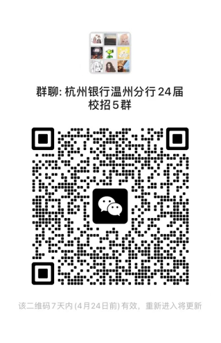 欢迎加入杭州银行温州分行2024届校招答疑群,群内将不定期发布最新校招资讯,并有专人解答校招问题。