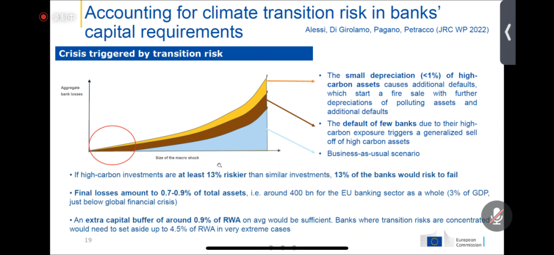 最后,Lucia Alessi 分享了自己的两篇研究论文,一篇题为 “ Accounting for climate transition risk in banks’ capital reguirements”,通过开发气候压力测试模型,评估欧盟银行资产负债表在气候转型风险下所表现的脆弱性,另一篇题为 “Materiality assessment on the ground:Tackling the financial materiality of climate physical risks”,展示了如何对威尼斯泻湖实施金融物质性评估,以应对气候物理风险。