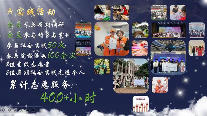 在社会实践中,她们全员参与暑期调研和研学实训,累计参与社会实践达50次,参与院校活动100余次,寝室有2名星级志愿者,2名成员获得暑期社会实践先进个人,累计志愿服务时长超400小时。