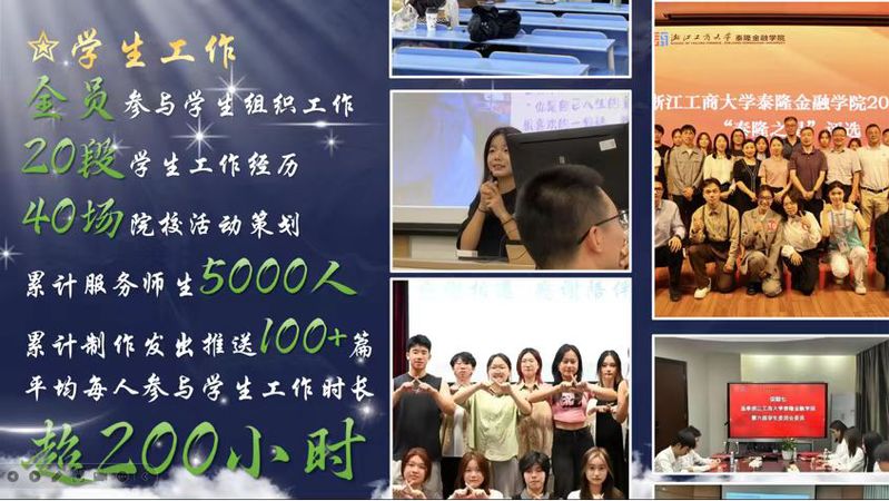 在学生工作方面,全员积极参加学生组织工作。寝室五位同学共有20段学生工作经历,40余场院校活动策划,累计服务师生5000人,累计制作发出推送100+篇,平均每人参与学生工作时长超200小时。