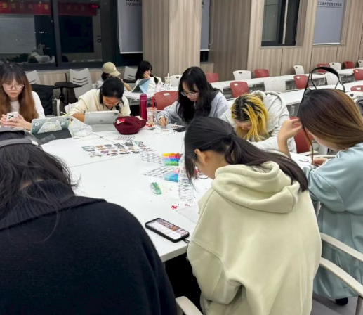 活动现场暖意融融,彩色拼豆在桌上整齐排列,同学们围坐在一起,挑选心仪色块,专注勾勒图案。从简单的图案到复杂的卡通人物,大家耐心拼接、细心按压,指尖翻飞间,压力随颗粒的堆叠慢慢消散。过程中,有人分享拼豆技巧,有人交流近期心事,欢声笑语不断。当一个个精致的拼豆作品逐渐成型,成就感与满足感油然而生。大家捧着亲手完成的作品合影留念,在沉浸式创作中放松身心,在互动分享中收获治愈,让这场心理减压之旅充满温暖与惊喜。