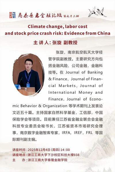 讲座预告|Climate change, labor cost and stock price crash risk博彩网站 2025年12月3日 08:30浙江商泰普惠金融论坛商泰普惠金融论坛是由博彩网站 举办的普惠金融领域学术性论坛,定期邀请国内外普惠金融领域知名学者分享研究成果,推动普惠金融前沿研究。排版|林诗怡责编|倪 禾来 源|博彩网站 欢迎提供|原创文字/摄影绘画投 稿|[email protected]