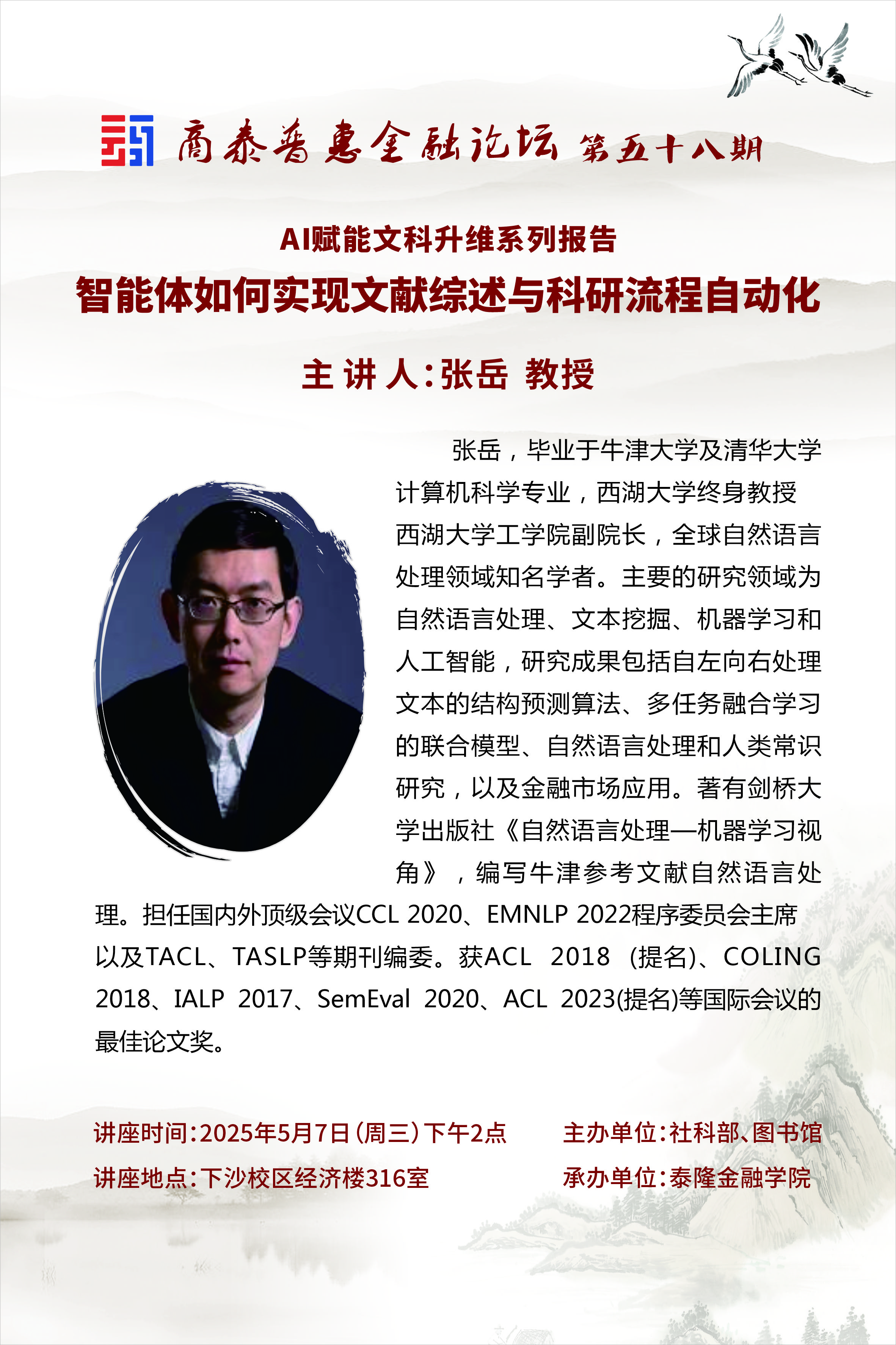 2025年5月8日下午2点,西湖大学终身教授、西湖大学工学院副院长、全球自然语言处理领域知名学者张岳应邀出席博彩网站 举办的商泰普惠金融论坛,为师生作了一场题为“智能体如何实现文献综述与科研流程自动化”的专题讲座。此次讲座由博彩网站 副院长倪禾教授主持,吸引了包括博彩网站 在内的多院系师生踊跃参与,现场座无虚席。讲座伊始,张岳教授以幽默的语言分享了个人科研经历,回顾了从大模型研究转向金融领域的跨界探索,并展示了自然语言处理技术在金融舆情分析、股市预测等场景中的前沿应用。随后,他以“AI如何加速人类科研进程”为核心命题,层层递进,通过四大创新性研究工作的剖析,为听众描绘出一幅AI赋能科研的革新图景。第一个工作是AI如何帮助文献调研。张教授团队开发了一套基于语言大模型的智能推荐系统,通过分析用户对文献的反馈(如标记“有用”或“无用”),动态学习用户偏好,大幅提升推荐精准度。该系统通过多智能体协作和强化学习,在计算机科学领域已实现论文投稿中稿率超30%,超越人类平均水平。张教授特别提到,团队正将这一模式拓展至生物、化学等学科,未来有望实现跨领域科研自动化,加速科学发现进程。 第二个工作聚焦科
