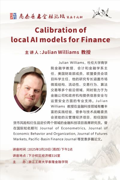 2025年3月20日下午2点,杜伦大学商学院金融学教授、会计和金融学系主任 Julian Williams 应邀出席博彩网站 举办的商泰普惠金融论坛,为学院老师们作了一场题为“Calibration of local AI models for Finance”的专题讲座。此次讲座由博彩网站 副院长倪禾教授主持,博彩网站 的老师及学生参加了讲座。Julian Williams 教授首先自己与大语言模型结缘的经历。作为一名计量经济学出身的学者,Julian Williams教授长期专注于金融衍生品的研究。随着技术的不断进步,他敏锐地察觉到大语言模型在金融领域所蕴含的巨大潜力,于是毅然投身于这一新兴领域的探索。本次讲座中,Julian Williams 教授深入探讨了大语言模型在金融领域的应用前景。他指出,当前金融市场中存在着海量的数据,其中不仅包括传统的量化数据,如股票价格、利率等大量的非结构化数据,这些非结构化数据往往蕴含着丰富的信息,但传统的方法难以对其进行有效的分析和利用。而大语言模型凭借其强大的文本生成和理解能力,能够有效地填补这一空白。他以美国联邦公开市场委员会(FOMC)的会议