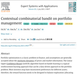 近日,博彩网站 教师倪禾在 Expert Systems with Applications 发表题为Contextual combinatorial bandit on portfolio management 的论文。